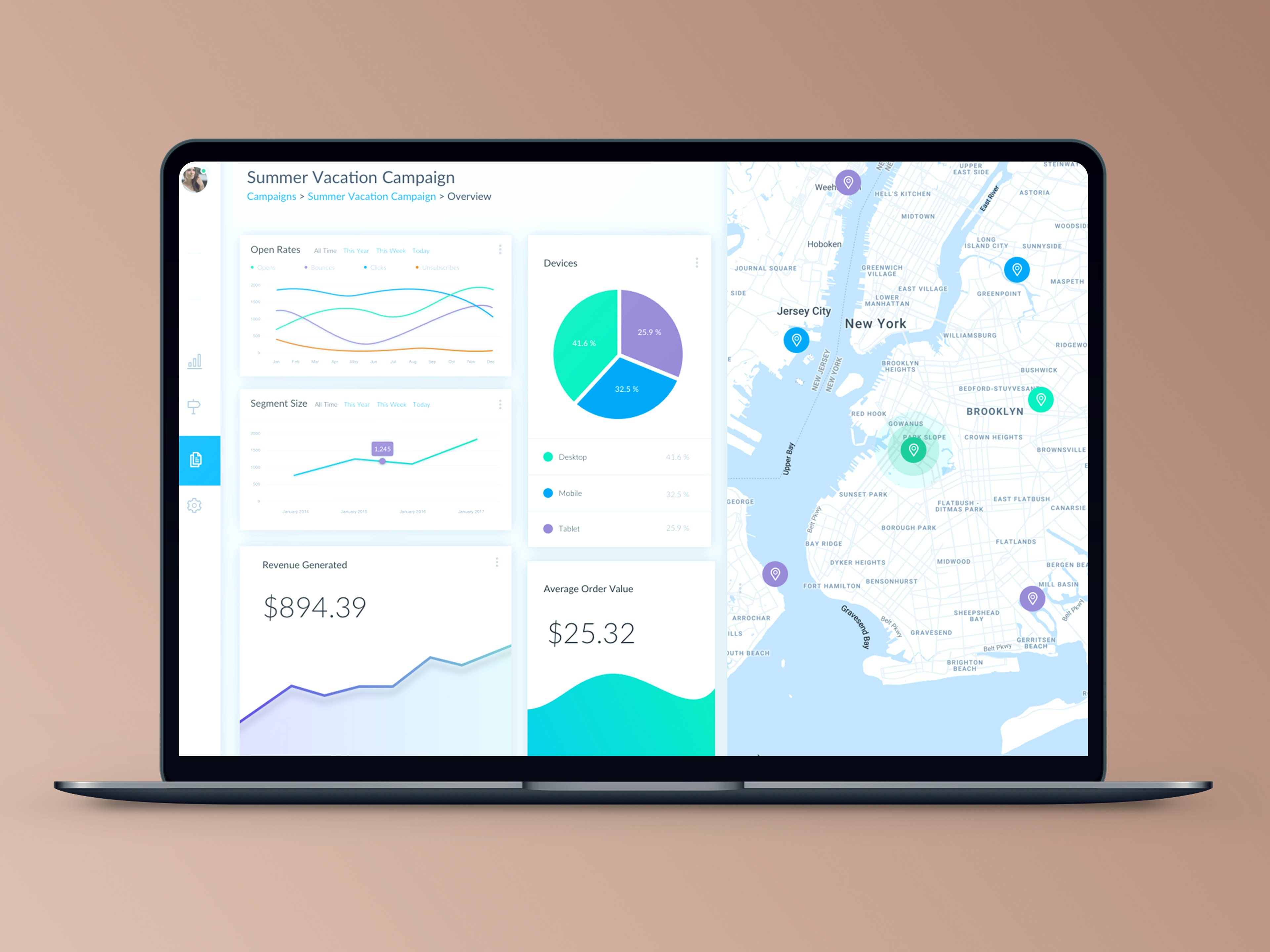 A dashboard to monitor an email campaign after sending. The large map on the right hand side allows the user to see when emails are opened or clicked and the other widgets pull some KPIs for a quick and easy glance.