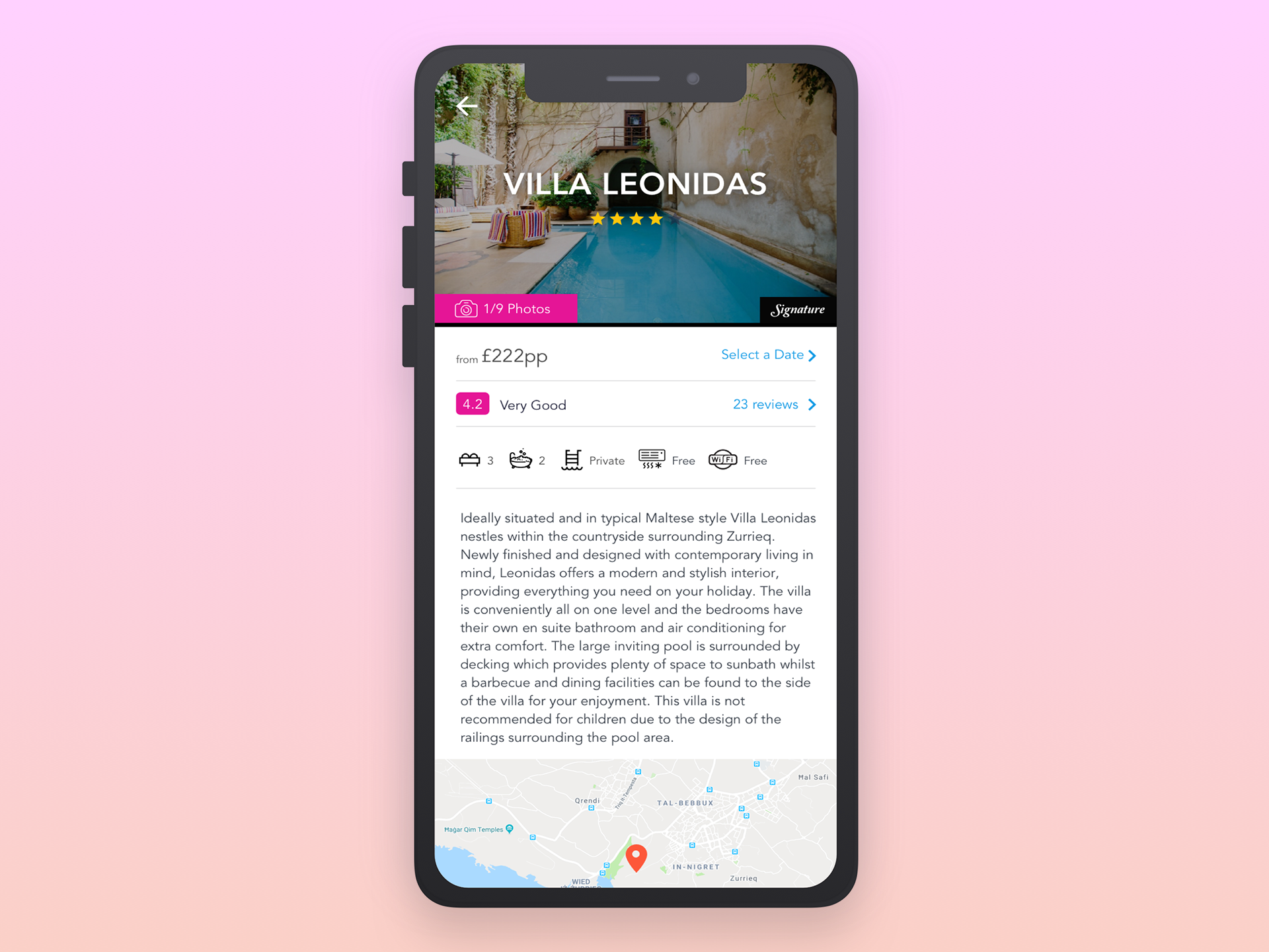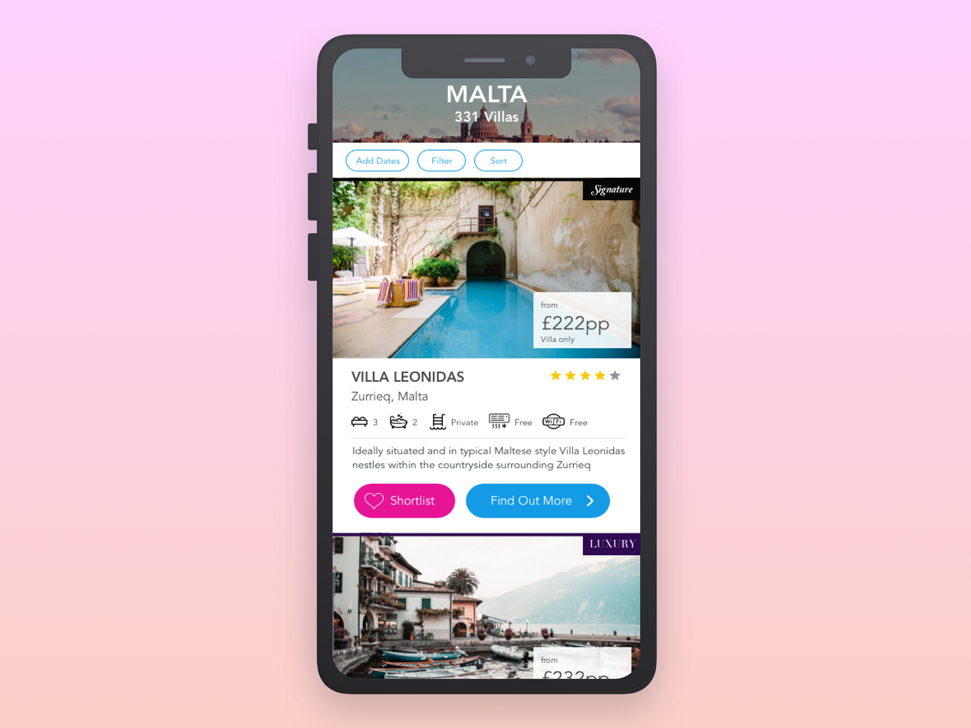 A villa rental app based around the discovery phase, so aimed at users that don't have any dates in mind
